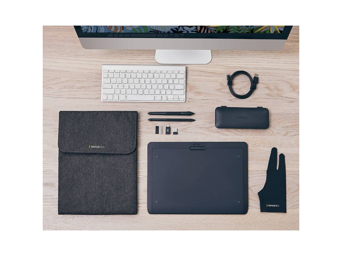 | Comprend | Tablette Xencelabs Medium, étui de transport, étui à stylos, stylet à 3 boutons, stylet fin, pointes standard, pointes en feutre, anneau d'extraction de plume, adaptateur USB-A vers USB-C, dongle, câble L, gant (moyen ; noir), guide de démarrage rapide, autocollant triangulaire |